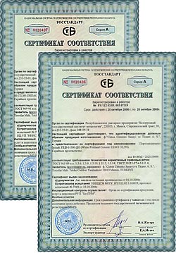 Компания "ЧИМСА", сертифицирована международным сертификатом TS-EN-ISO2000, подтверждающим качество систем производства, организации и технологии и сертификатом соответствия европейским стандартам EN 197-1 СЕМ I 52,5 N, дающим право ставить фабричную марку СЕ для белого портланд цемента.